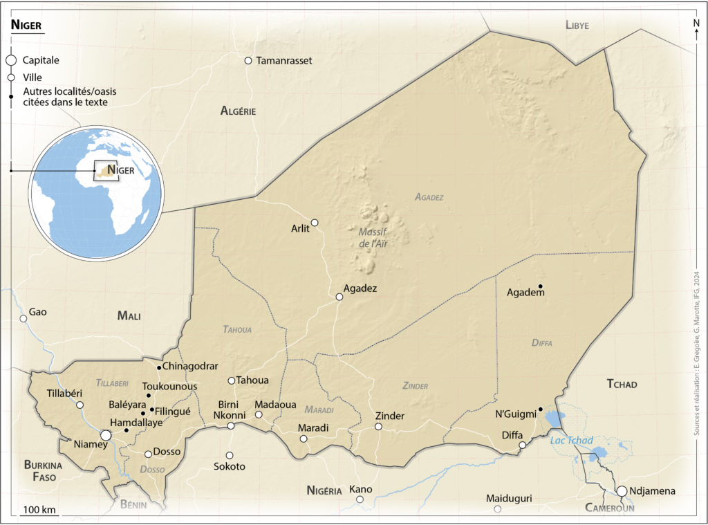 Emmanuel Grégoire est directeur de recherche émérite à l’Institut de Recherche pour le Développement (IRD) et spécialiste de la géopolitique de la zone sahélo-saharienne. Il a proposé à l’IFG de publier son analyse unique de la junte qui a pris le pouvoir au Niger en juillet 2023. Vous pouvez trouvez cet article exclusif en PDF ci-dessous, accompagné d’une carte* qui permet de mieux visualiser ce territoire, conçue par notre cartographe, Guilhem Marotte.