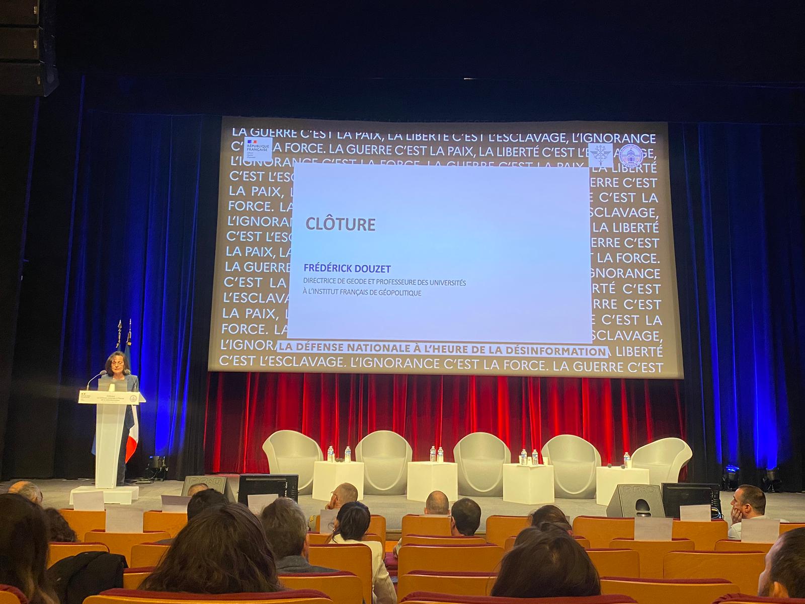 Frédérick Douzet, professeure des Universités et directrice de GEODE, a conclu ce colloque sur la désinformation de l’Académie de Défense de l’École Militaire (ACADEM) en mettant en avant l’importance de comprendre les menaces actuelles. Elle a insisté sur la nécessité d’étudier les acteurs, leurs motivations et les effets recherchés, tout en tenant compte du contexte géopolitique pour éviter les manipulations.