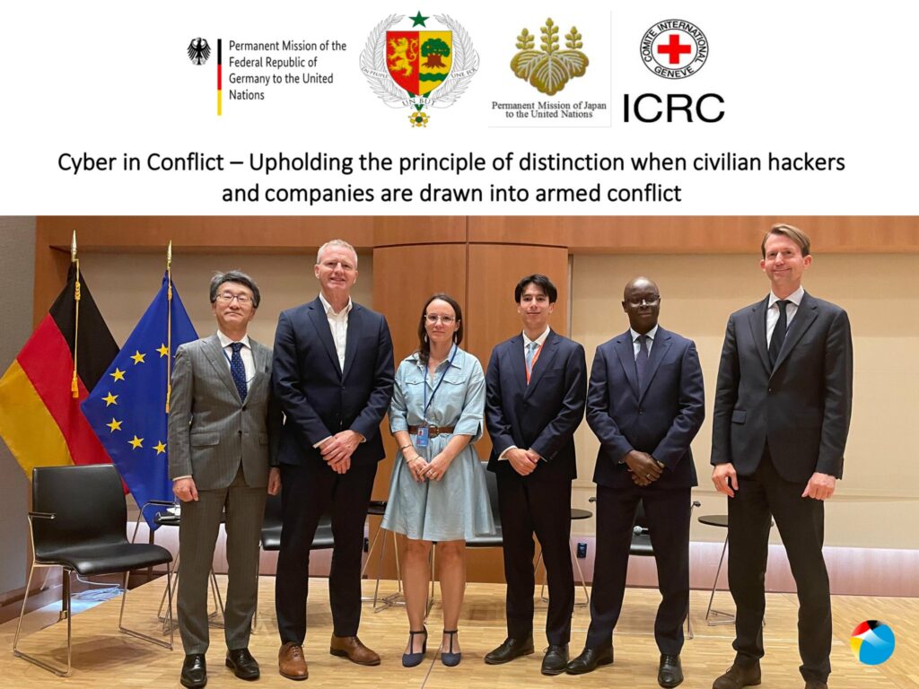 Par ailleurs, le 8 juillet, Aude a pris part à un événement majeur en marge de l’OEWG co-organisé par les missions permanentes de l’Allemagne, du Japon et du Sénégal, en collaboration avec le Comité international de la Croix-Rouge. Sous le thème “Cyber in Conflict – Upholding the principle of distinction when civilian hackers and companies are drawn into armed conflict“, elle a partagé ses perspectives sur les aspects juridiques de ce sujet complexe.