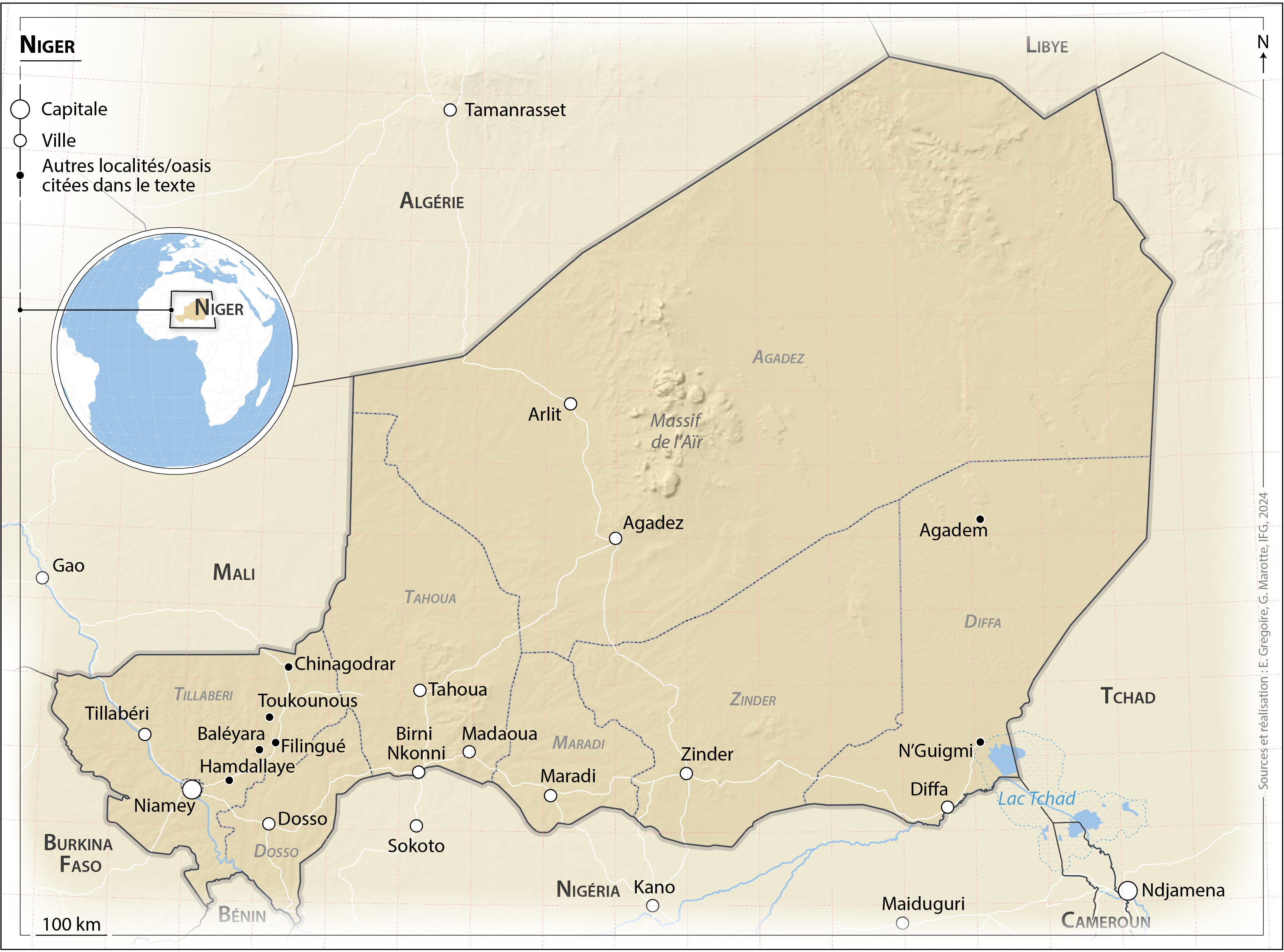 Emmanuel Grégoire est directeur de recherche émérite à l’Institut de Recherche pour le Développement (IRD) et spécialiste de la géopolitique de la zone sahélo-saharienne. Il a proposé à l’IFG de publier son analyse unique de la junte qui a pris le pouvoir au Niger en juillet 2023. Vous pouvez trouvez cet article exclusif en PDF ci-dessous, accompagné d’une carte* qui permet de mieux visualiser ce territoire, conçue par notre cartographe, Guilhem Marotte.