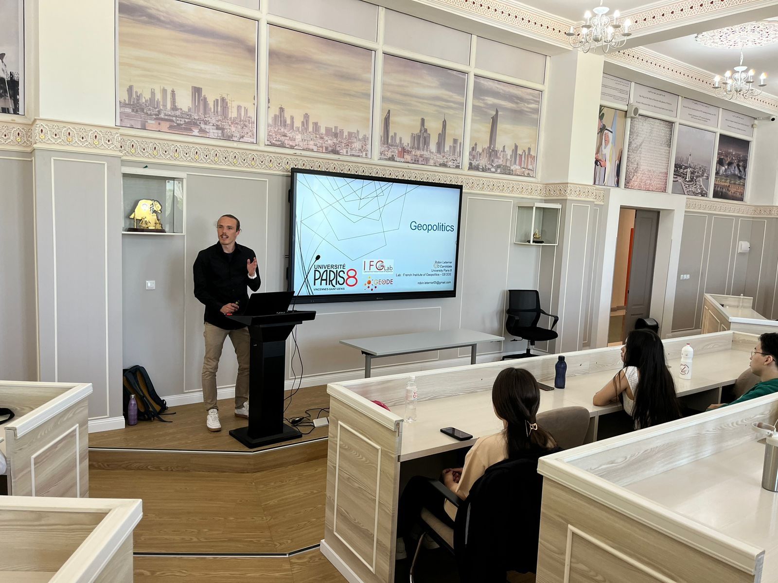 Robin Leterrier a eu l’opportunité de présenter aux étudiants de l’International School of Economics (ISE) d’Astana, les origines de la géopolitique, en particulier de l’école française de géopolitique. Il a également offert un aperçu des recherches en cours à l’Institut Français de Géopolitique (IFG) et à GEODE, en détaillant les méthodologies employées et la pertinence de ces études dans le contexte géopolitique mondial actuel.
